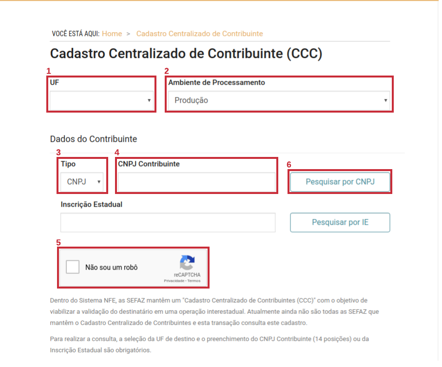 Para consultar o CNPJ e a IE no Cadastro Centralizado de Contribuintes, siga os passos abaixo: