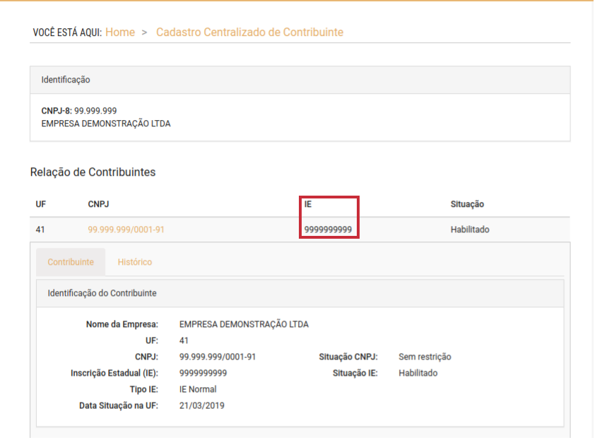 Ao realizar a pesquisa, será exibido o resultado com as informações da empresa, é possível verificar se ela está habilitada para emissão e a relação do CNPJ e da IE.