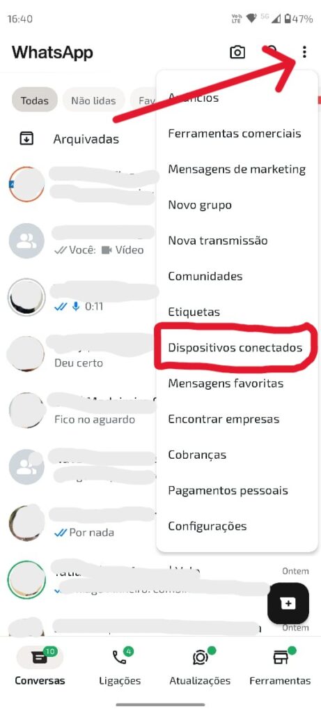 Com o celular em mãos clique nos 3 pontinhos do lado direito em cima, após clicar nós 3 pontinhos clique e Dispositivos conectados.