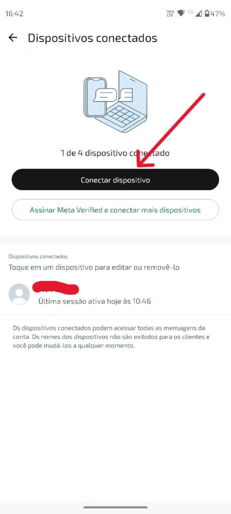 Após clicar em Dispositivos conectados clique em Conectar dispositivos. Agora aponte a câmera para o QR Code na tela.