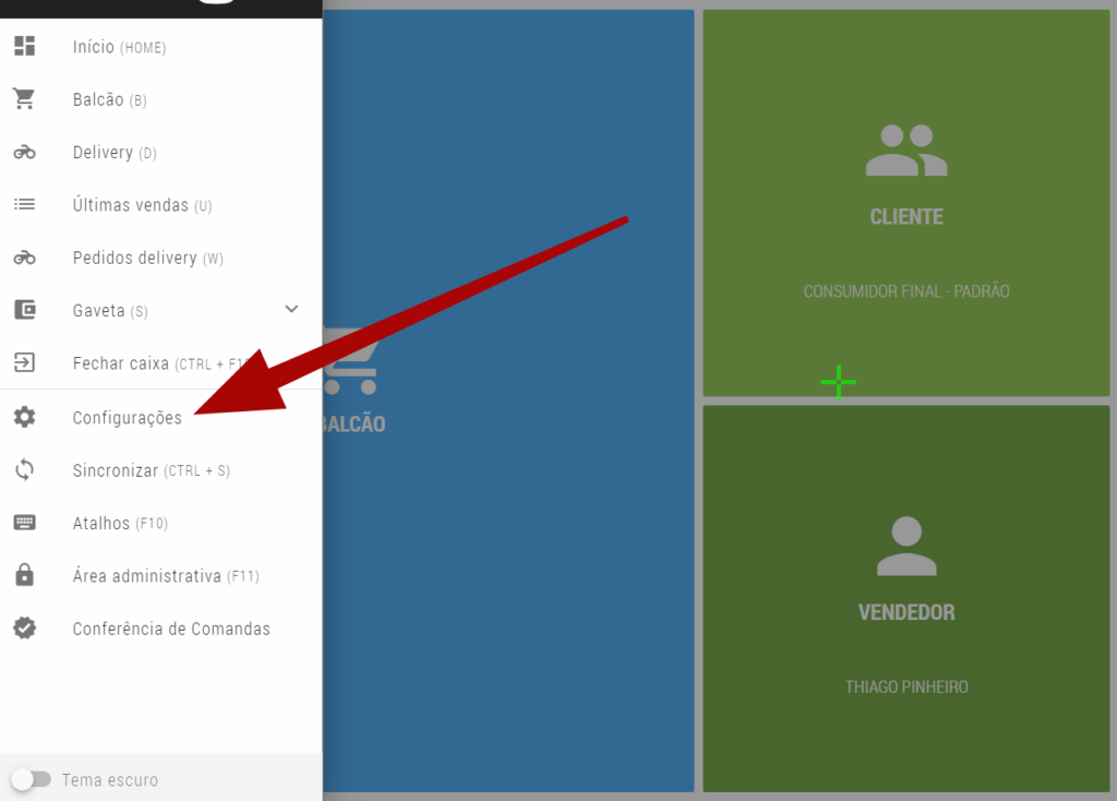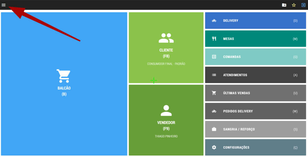 Com o PDV aberto, clique nos três risquinhos em cima no lado esquerdo, conforme imagem abaixo: