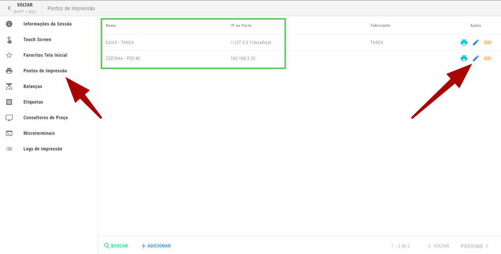 Após clicar em configurações a janela abaixo será aberta, clique em Pontos de Impressão, no lado direito irá aparecer todas as impressoras conectadas no sistema, localize a impressora que não esta imprimindo e clique no lápis para editar o IP da impressora, conforme imagem abaixo.