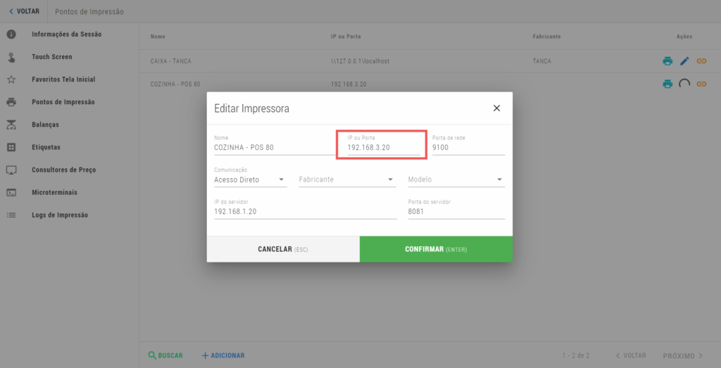 Ao clicar no lápis da impressora que deseja mudar o IP, irá aparecer a opção de Editar Impressora, edite o IP conforme o quadrado abaixo. Não esqueça de colocar os pontos do IP conforme foi impresso no papel de auto teste da impressora, por exemplo: 192.168.1.1.