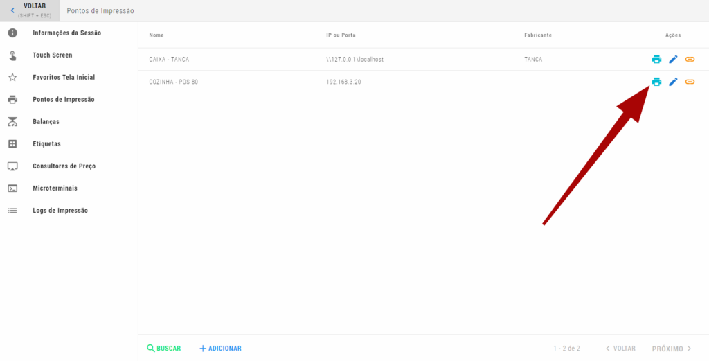Depois que alterar o IP e clicar em confirmar, faça um teste de impressão, clicando na impressora ao lado do lápis.
